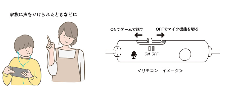 ON/OFF切り替え可能なマイク付きのリモコンを搭載し、ゲーム中にボイスチャット※1が楽しめます。 また、ハンズフリー通話や音楽などの再生/一時停止/スキップなどのリモート操作にも対応しています※2。