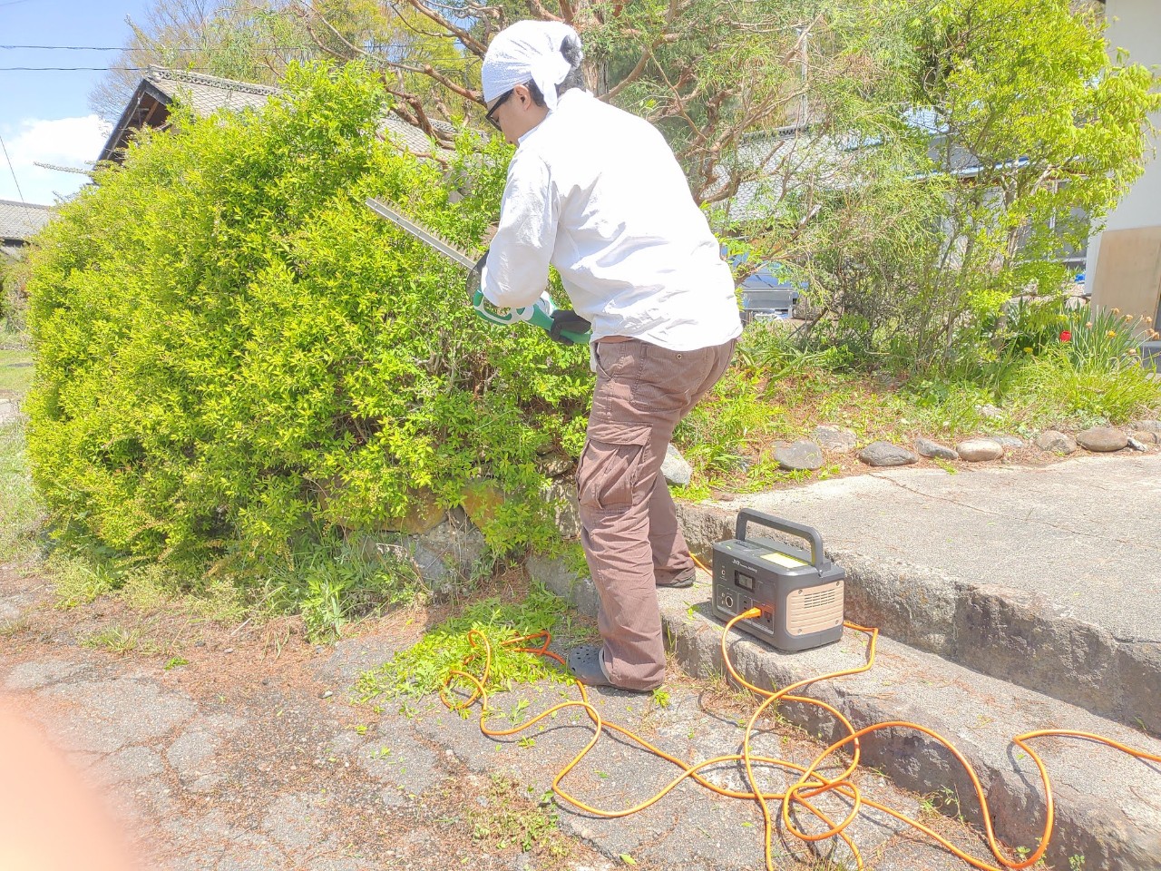 これが、ポータブル電源の導入で、一気に解消されました。というのも、電動バリカン本体の電源コードが10mであれば、ポータブル電源を中心に、直径20mの植栽を剪定できるからです。例えば、長さ20mの生け垣も、一度のセッティングで刈っていけます。