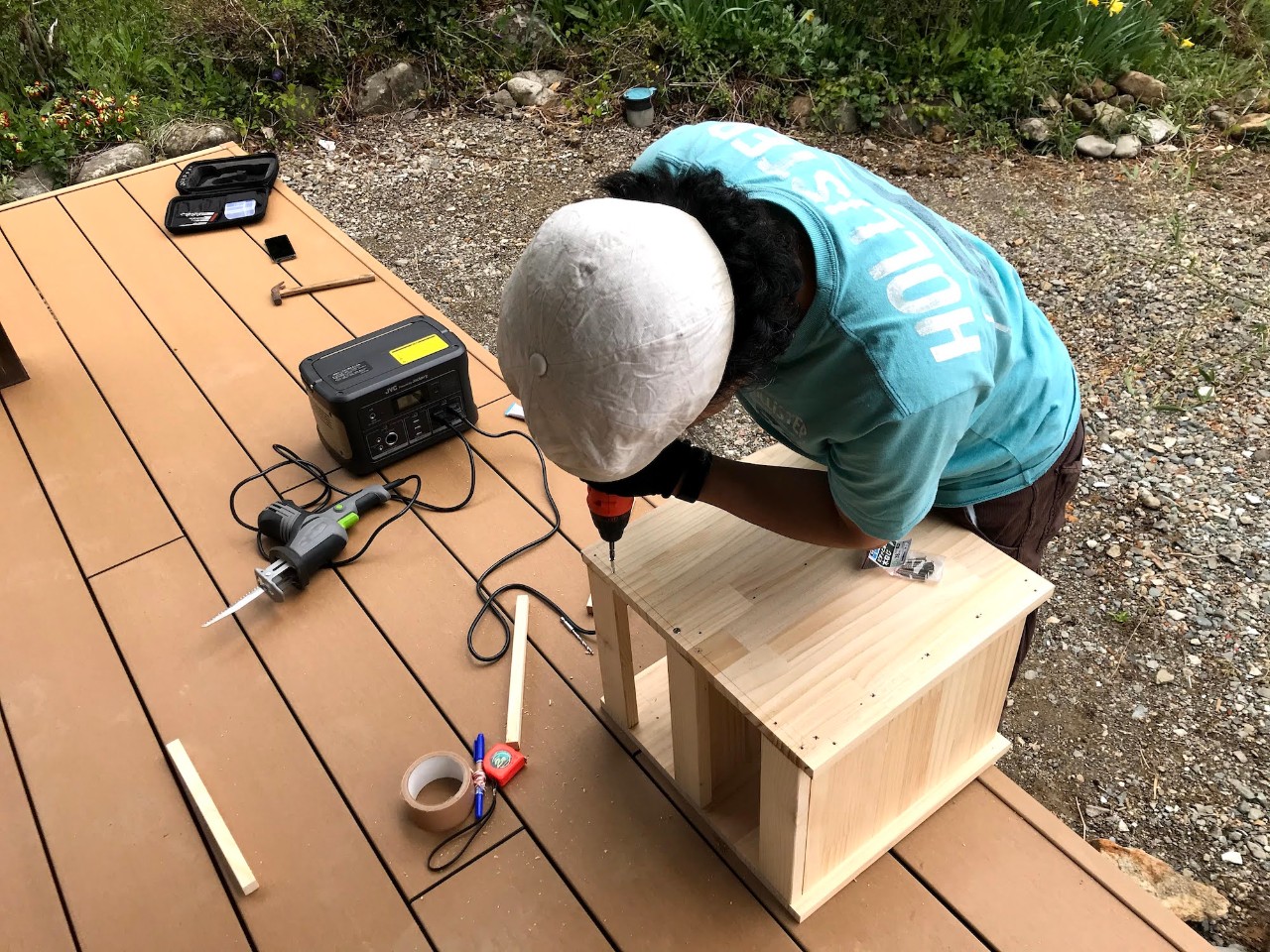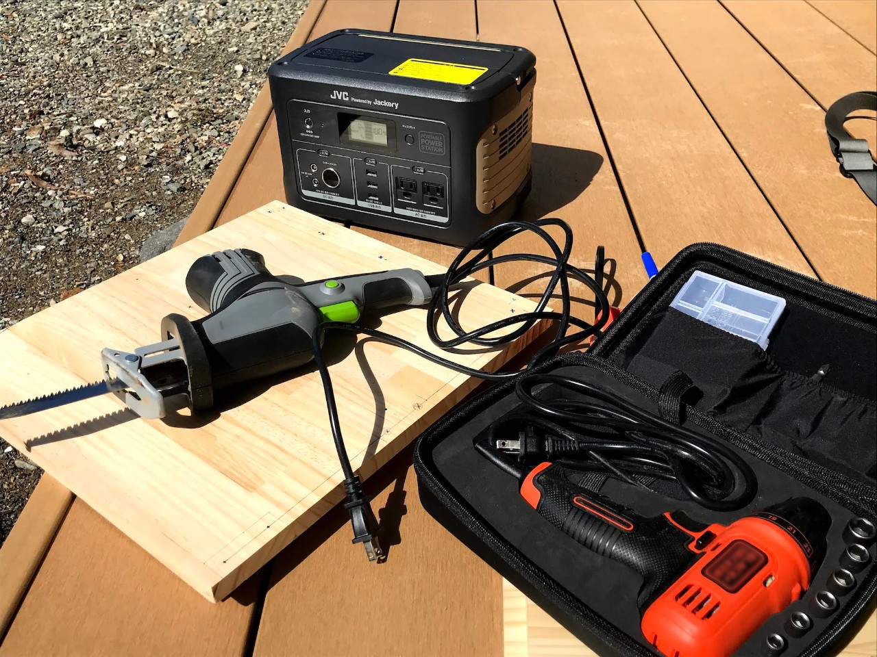 使用した電動ノコギリは、定格消費電力が350W。電動ドリルドライバーは同じく90W。ポータブル電源には、ACコンセントが2つ搭載されているので、両方を同時に接続しておけますし、同時に使用することもできるはずです。1人で作業するので、実際に両方同時に使用することはありませんでした。ただし、使うたびにコンセントを抜き差しする必要がなく、使いたいと思った時に、電動ノコギリも電動ドリルドライバーもパッと使えるのはありがたいです。