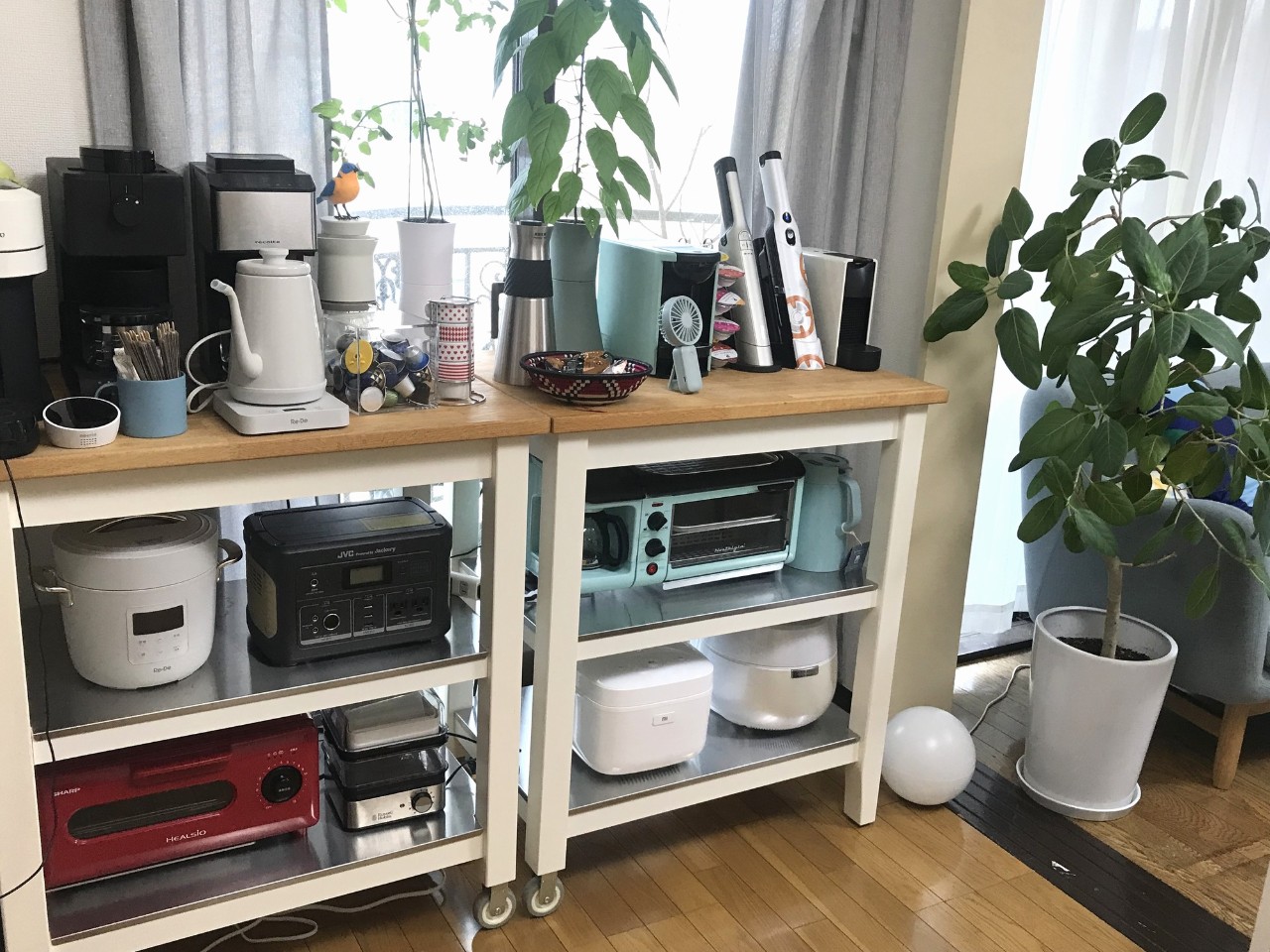 日常使いをするためのおすすめの使い方は、リビングやダイニングの棚などに定位置を作ってしまうこと。アトリエではキッチン家電と一緒にワゴンの棚に並べて置いています。コーヒーメーカーや炊飯器、トースターといった家電製品と並べても違和感のないサイズ感で、アトリエの風景に馴染んでいるところがいいなと思っています。一般のご家庭でもこんなふうに家族で過ごす場所にポータブル電源を置いてみてほしいなと思います。