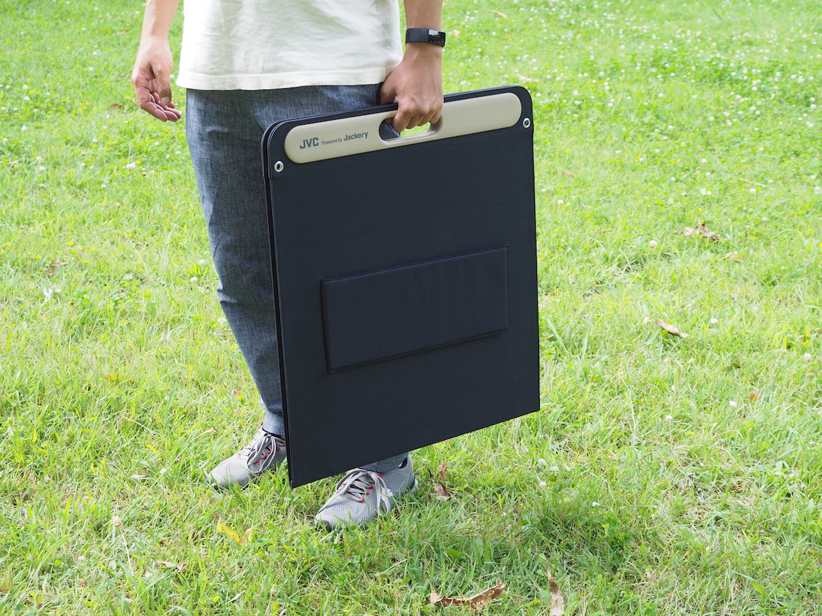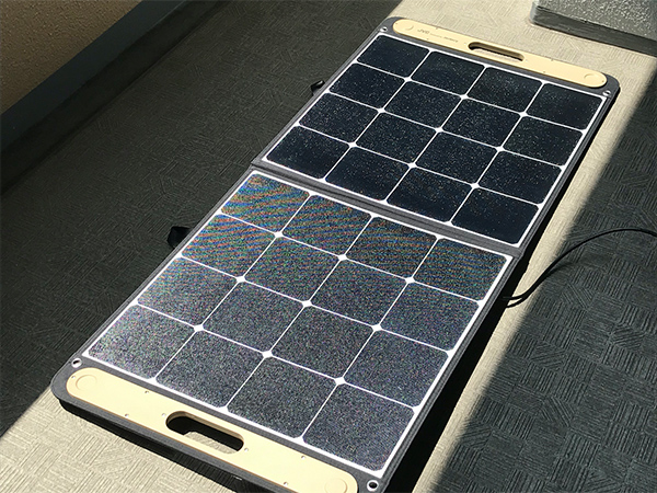 ポータブルソーラーパネルは、2つ折りになっているのを、太陽の方向に広げます。あとは背面のポケットに収納されている接続ケーブルを引き出して、ポータブル電源に差すだけ。