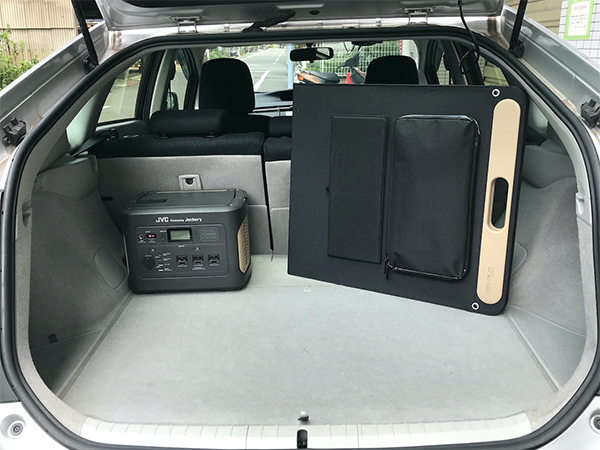 ちなみに本体サイズは幅333×奥行234×高さ244mmなので、自動車のトランクに入れても、かさばりません。下の写真は、プリウスにポータブル電源「BN-RB10」を入れたところです。この大きさならば、キャンプ道具と一緒に持っていけますよね。