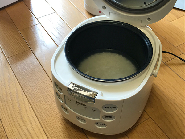 そこで次は、小型炊飯器でご飯(1合)を炊いてみることにしました。お湯と炊飯が電気で手軽に作れれば、車中泊もかなり快適になるでしょう。だって、これをコンロや携帯バーナーなどで行なうとすれば、自動車内では危険です。また、車外で行なうにも雨天時などは特に場所選びなどが面倒です。