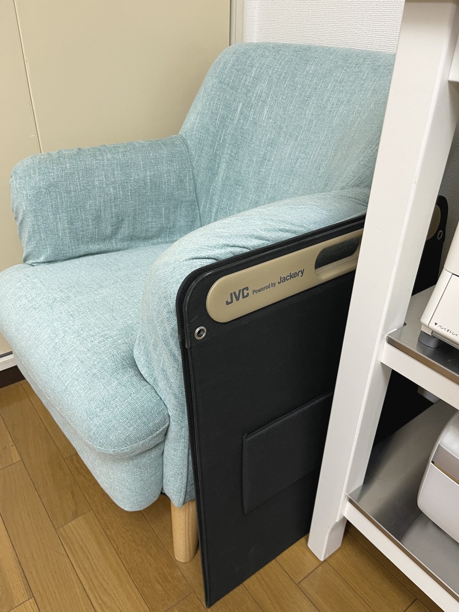 ところがJVCのポータブル電源BN-RBシリーズには、専用のオプション品として電気がない屋外でも安心&エコロジー充電が可能なポータブルソーラーパネルがあると知って、ぜひとも使ってみたいと思ったのです。今回使用したポータブルソーラーパネル「BH-SP100-C」は、最大外形寸法は1,225×540×25mmで、両腕を広げたほどの大きさがありますが、パタンと2つ折りに出来るので、部屋に置いてもかさばらず、重さも4.2kgと、女性でも楽々持ち運びできるサイズ感がちょうどいい感じです。両端が取手の形状になっていて、2つに折り畳んだ状態で持ちやすいのがうれしいなと思います。アトリエではマッサージソファとワゴンの間の隙間が定位置になり、いつもここでスタンバイしています。