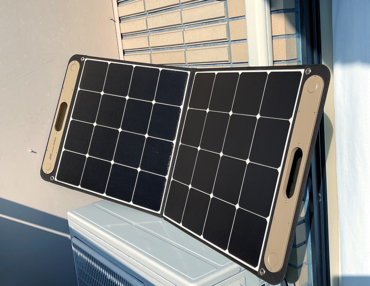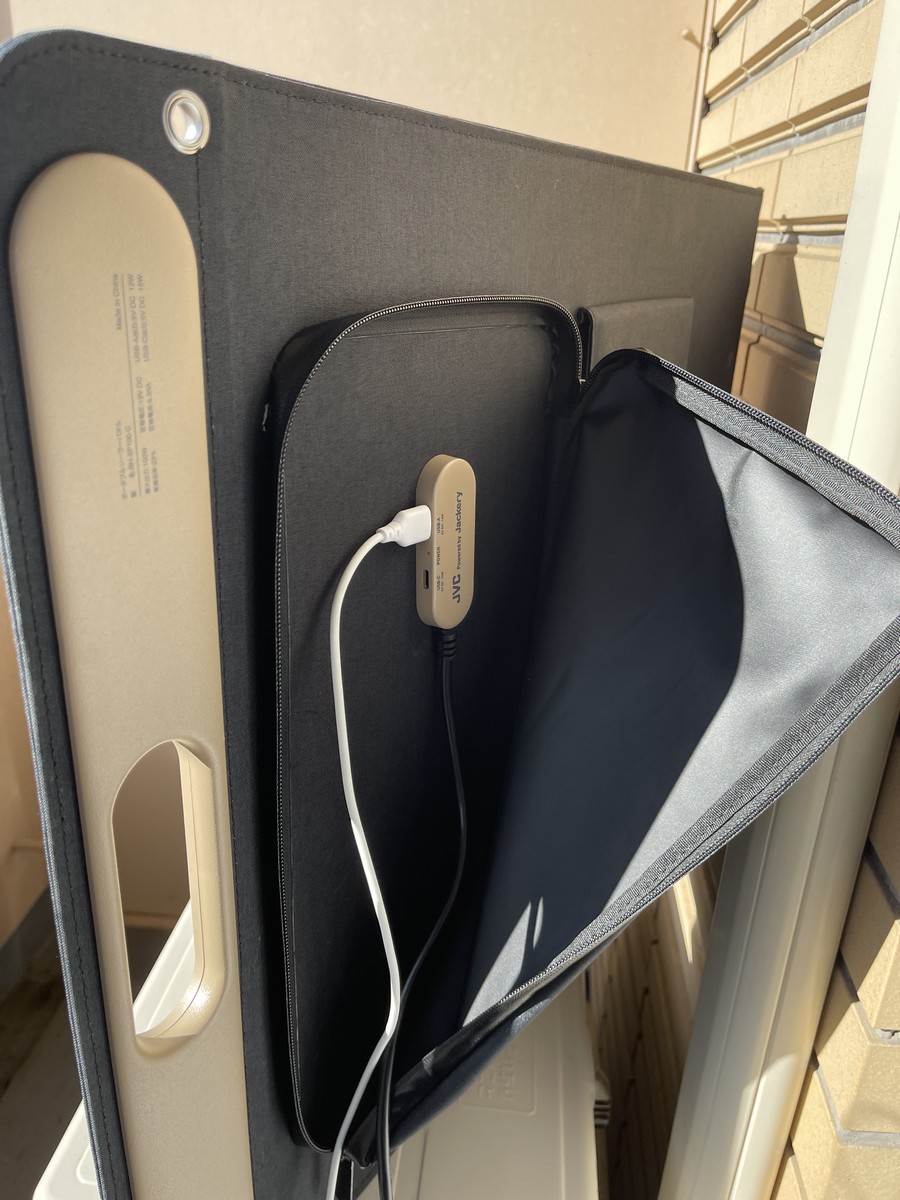 さて、普通ならポータブル電源だけでなくポータブルソーラーパネルまであれば、アウトドアライフが益々充実するし、災害などもしもの時にもさらに安心になる……って思いますよね? でもね、違うんです。ポータブル電源をもう一つのコンセントとして日常づかいする暮らしを楽しんでいる私ですから、このポータブルソーラーパネルも日常づかいが重要。晴れた日にはベランダに持ち運んでポータブル電源と繋いで充電しておこうという作戦です。