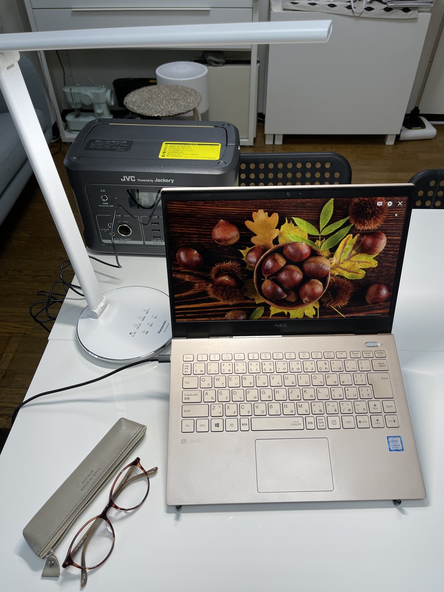 夕方LEDデスクスタンドを使う時にもポータブル電源の出番です。