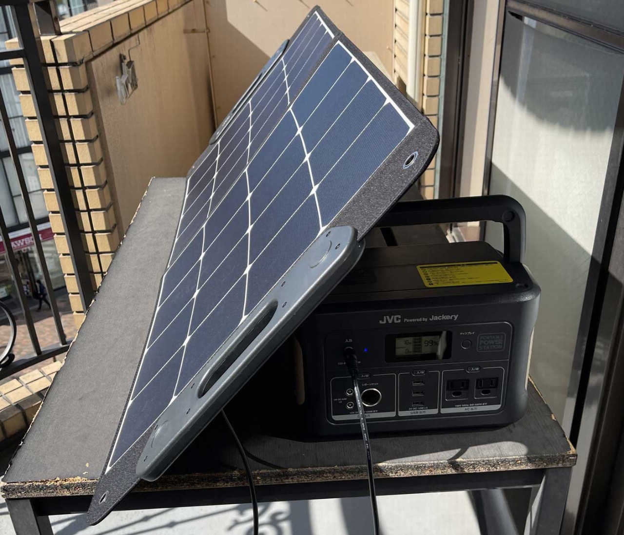 晴れた日にベランダにポータブルソーラーパネルを持ち出して太陽光発電をして、それをポータブル電源に繋いで貯めておこうという“ベランダ発電&電気のちょこっと貯金”は、アトリエで仕事をする際の習慣になっています。太陽の光によって電気が作られて、ポータブル電源に表示される電池残量の数字が増えていくのがうれしくて、楽しくて! だからアトリエにいるときに、ちょっとした隙間時間にも晴れ間が出ているとポータブルソーラーパネルを取り出して、ベランダへ。太陽がなるべくたっぷり当たる場所や向きを探して、そこに立て掛け、ポータブル電源の入力端子に繋ぐ毎日なのです。