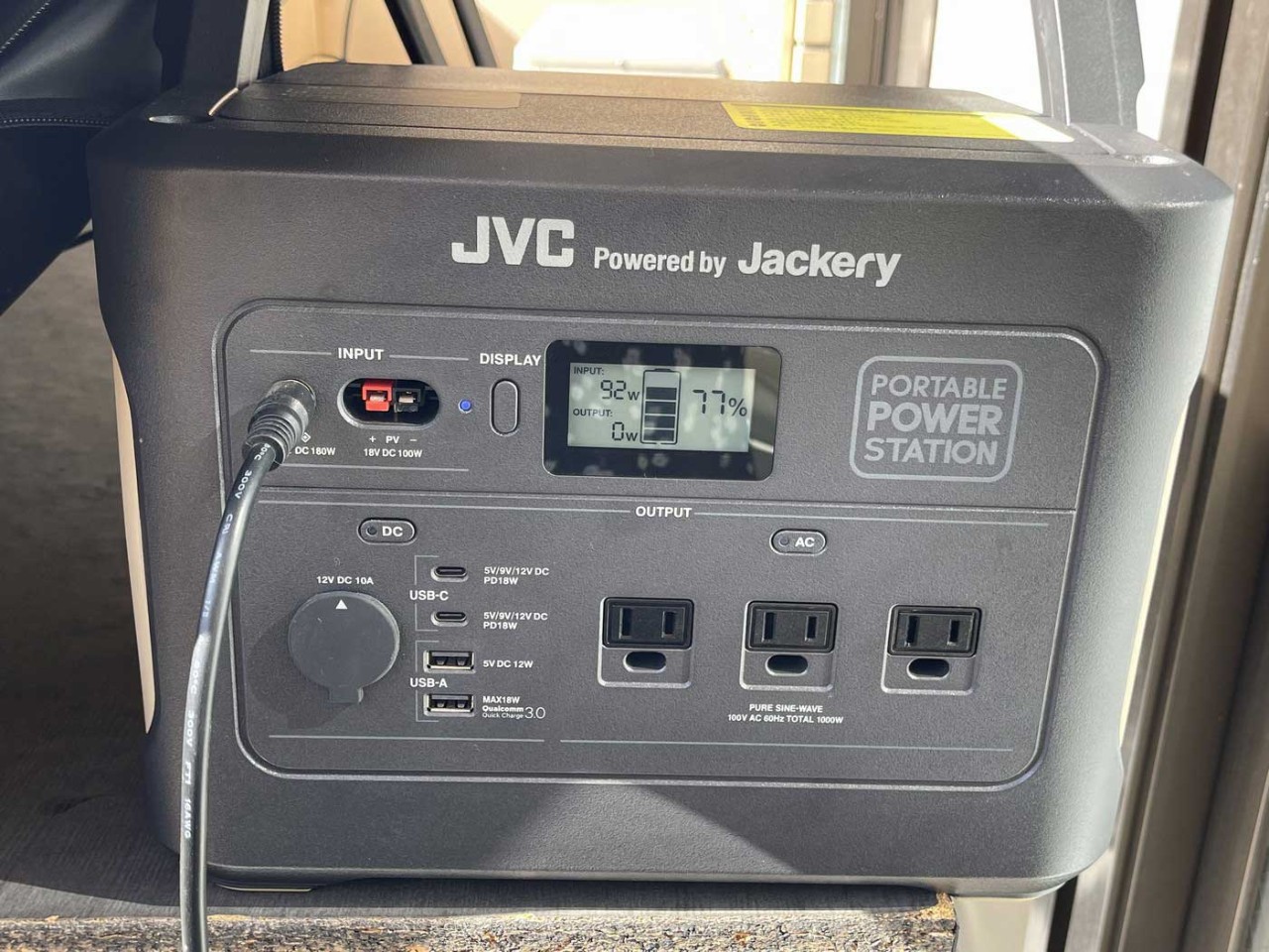 この日はパワフルモデルのポータブル電源BN-RB10-Cに繋いで“電気のちょこっと貯金”中。INPUTの電力が92Wと表示されていて、夕方には残量が100%に!