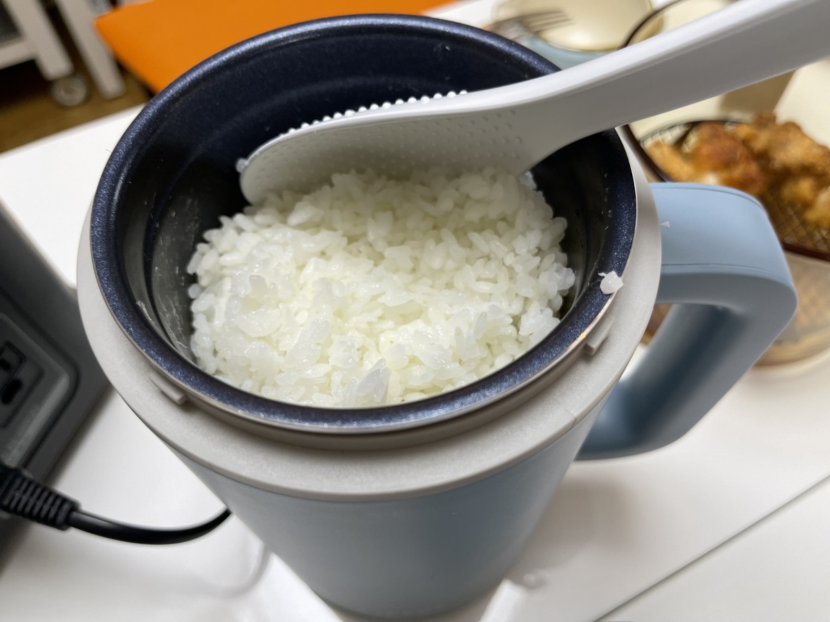 さあ、炊き上がりました。炊飯開始時は75%だった電池残量が、炊飯終了時に確認すると42%に。ごはんの味わいはややしゃっきり寄りでしょうか。正直に言うと、そこまで感動する味わいではありませんでしたが、お米との相性もあるのかも。ポット型なので置き場所を取らないというのは魅力ですし、ワンルームに住む若い一人暮らしの方には生活感が漂わず、おしゃれなアイテムとして人気が出るかもしれませんね。