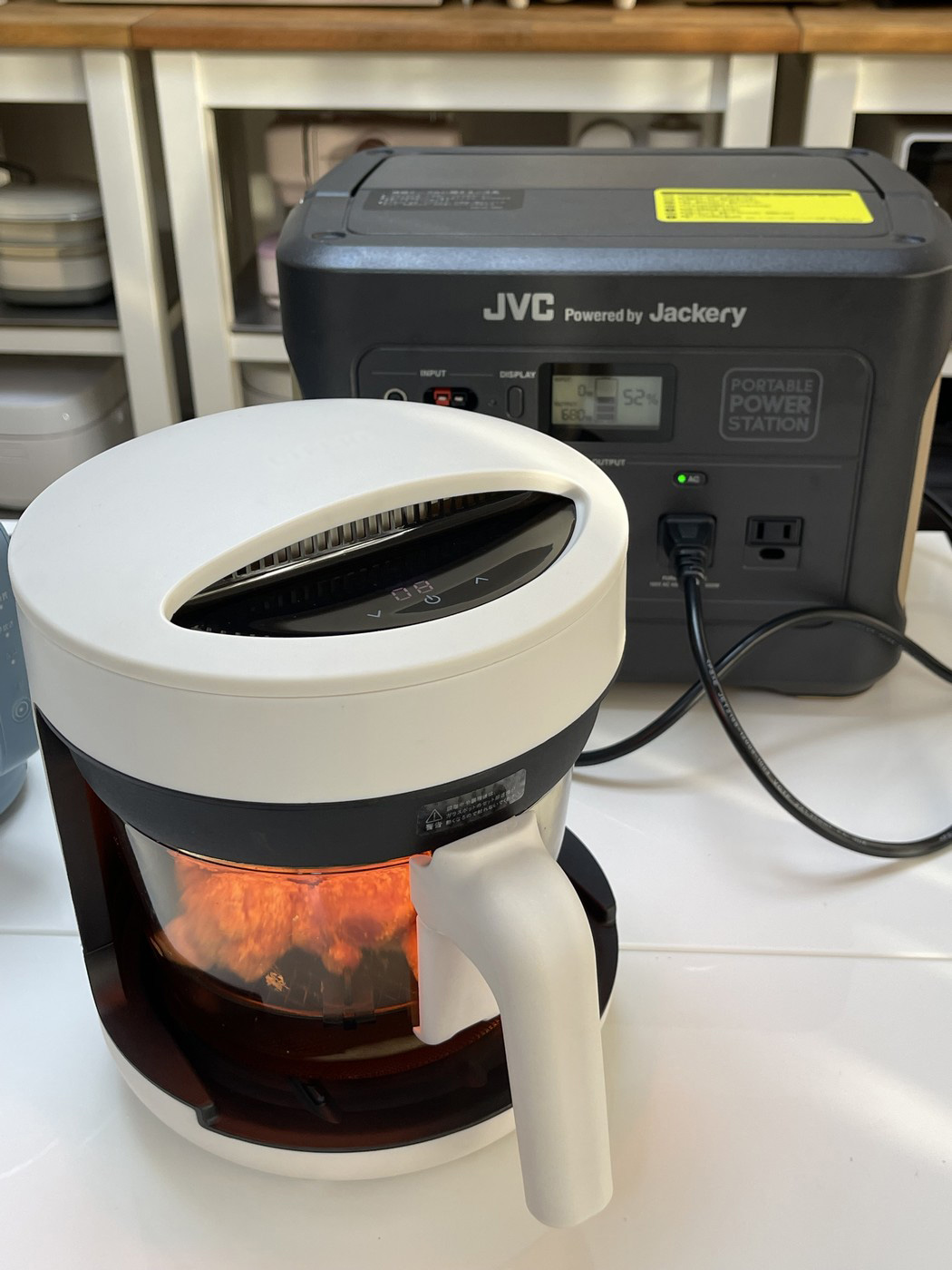 さて、こうして貯めた電気で今日は、おひとり様用のコンパクトなコンベクションオーブンを試してみることにしましょう。ガラスのポット型で、本体上部にヒーターとファンが付いており、熱風の力で食材を調理したり、お惣菜の温め直しなどができる調理家電です。