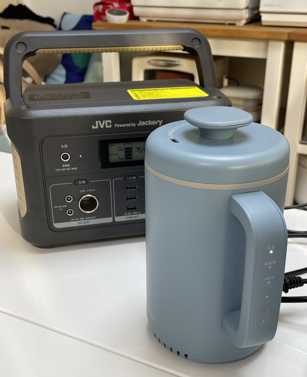 ポット型のIHライスクッカー。定格消費電力が400Wなので、スタンダードモデルのポータブル電源「BN-RB62-C」でも使えます