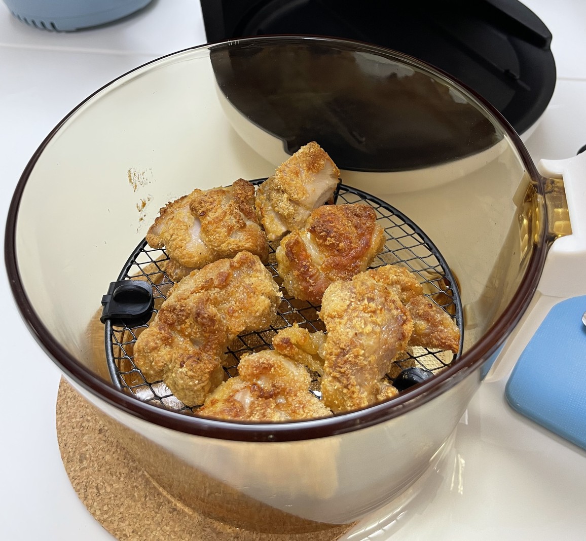 作ったのは、鶏のから揚げ。5切れほどの鶏もも肉に市販のから揚げ粉をまぶし、ガラスポットの底に付属の網をセットしてその上に鶏肉をおくだけで、油を使わずに揚げ物ができるのです。以前に「ノンフライヤー」「エアフライヤー」などの名前の大きな家電が注目されましたが、あれの超コンパクト版ですね。