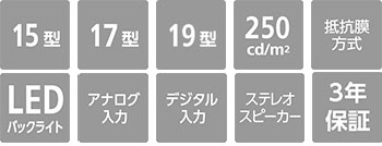 | 基本仕様 | 15型XGAタッチパネル | 17型SXGAタッチパネル | 19型SXGAタッチパネル | |||