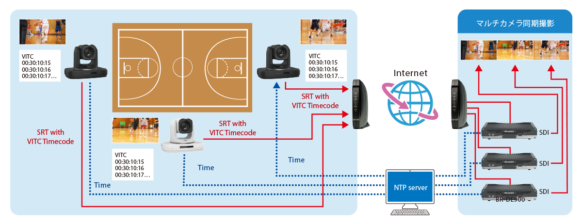 ストリーミングに重畳されたNTP(Network Time Protocol)を基にしたVITC(Vertical Interval Time Code)により、ネットワーク経由で複数台のカメラを同期させることが可能です。マルチカメラ撮影での各カメラの同期が重要なコンサート、スポーツなどのストリーミング配信や映像制作におけるミキシング作業時の利便性が向上します。