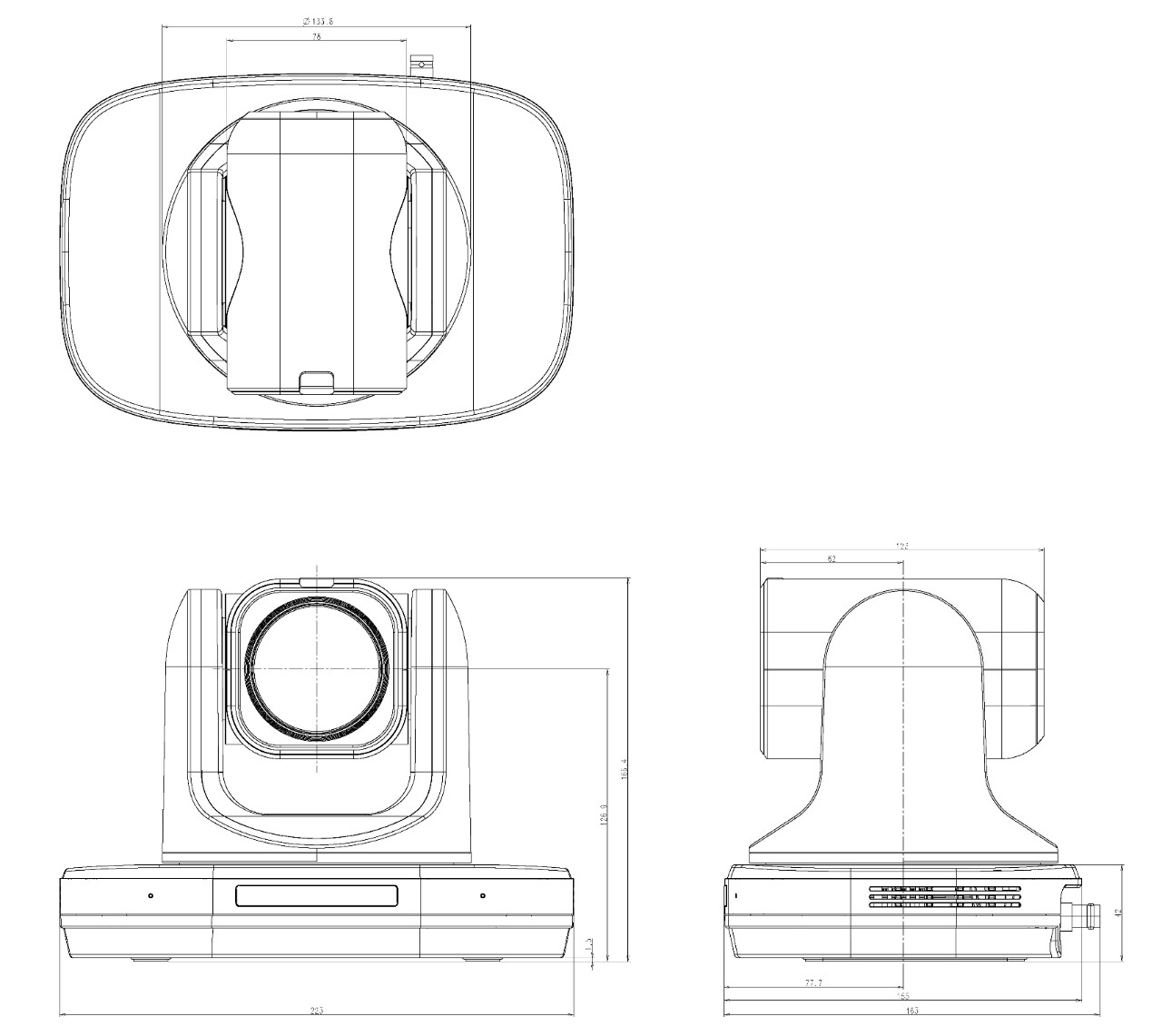 外形寸法 幅223.0x 高さ 166.4 x 奥行 155.0mm(天井取付金具、突起部含まず)