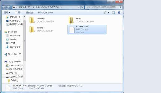 6. リムーバブルディスクを開くと、Dubbing、Music、Recordのフォルダがあります。