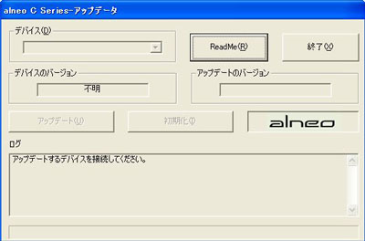 「alneo C Series-アップデータ」の画面上の「デバイスのバージョン」が1.04.0646になっていれば、正常にアップデートができています。
