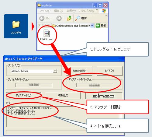 「FLASH.enc」ファイルを「alneo C Series-アップデータ」にドラッグ&ドロップします。