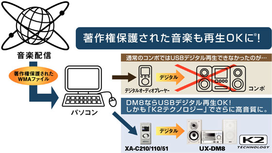 ビクターのメモリーコンポ[UX-DM8]とUSB接続すれば、音楽配信サイトからダウンロードしたWMA-DRMファイルを、コンポのデジタル高音質で再生可能。デジタルオーディオプレーヤーに入れたお気に入りの曲を室内でもハイクォリティな音質で手軽に楽しめます。