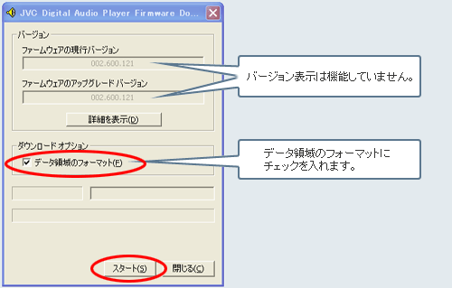 次に、「データ領域のフォーマット」にチェックを入れ「スタート」ボタンを押します。