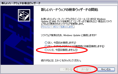 「新しいハードウェアの検出ウィザード」が表示されますので、「いいえ、今回は接続しません」を選択し、「次へ」をクリックします。
