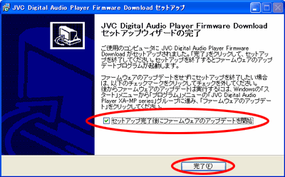3. セットアップウィザードが完了しますと、次にファームウェアをアップデートするかどうかのチェックボタンが表示されます。「ファームウェアのアップデートを開始」にチェックをして、「完了」ボタンをクリックします。(チェックをしない場合はセットアップのみ完了しますが、データのアップデートは実施せずここで終了します。)