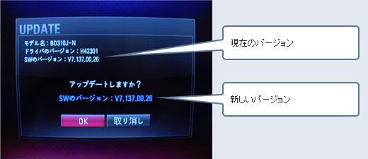 5. TV画面がUPDATE画面となります。「現在のバージョン」と「新しいバージョン」を確認してください。同じであれば、アップデートの必要はありません。「取り消し」を選択して「決定」ボタンを押して、アップデートを止めてください。